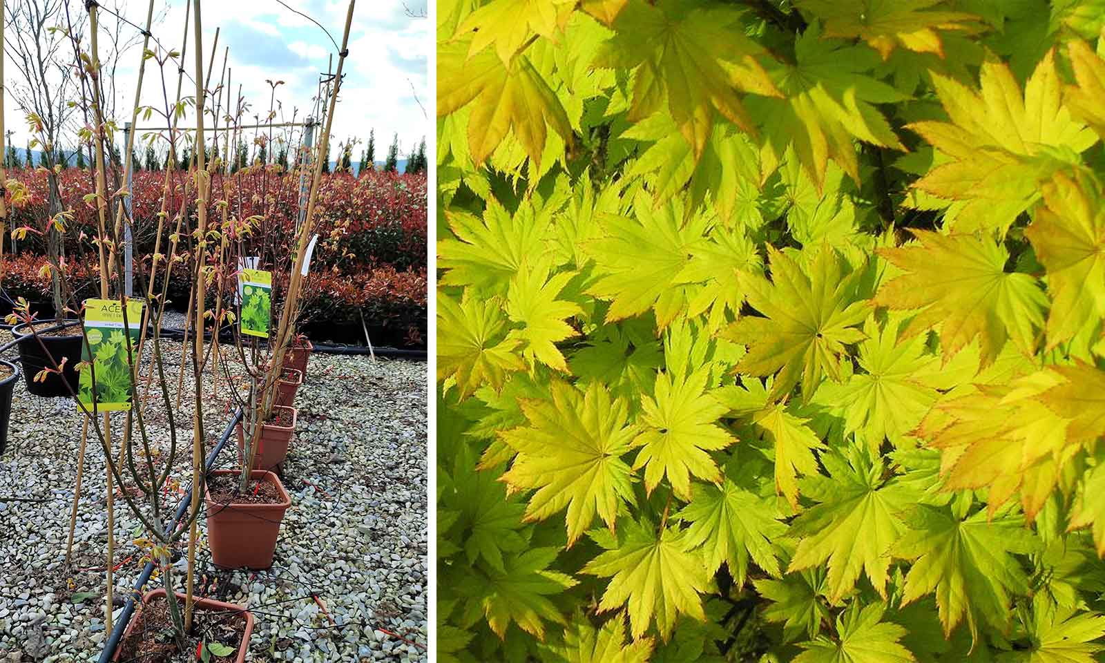 They require cool, light, moist but well drained soil, slightly acid and clay. Good results are obtained in different types of soil as long as it is not heavy, stagnant or calcareous and an acidic supplement is given. Must be placed in half-shade or in a sunny position, protected from strong winds. Half-shade is absolutely necessary if the soil is sandy or very light, in hot or dry areas. Acer Shirasawanum ‘Jordan’ – slow growing shrub with bright golden foliage in spring, turning rich red in summer and autumn.