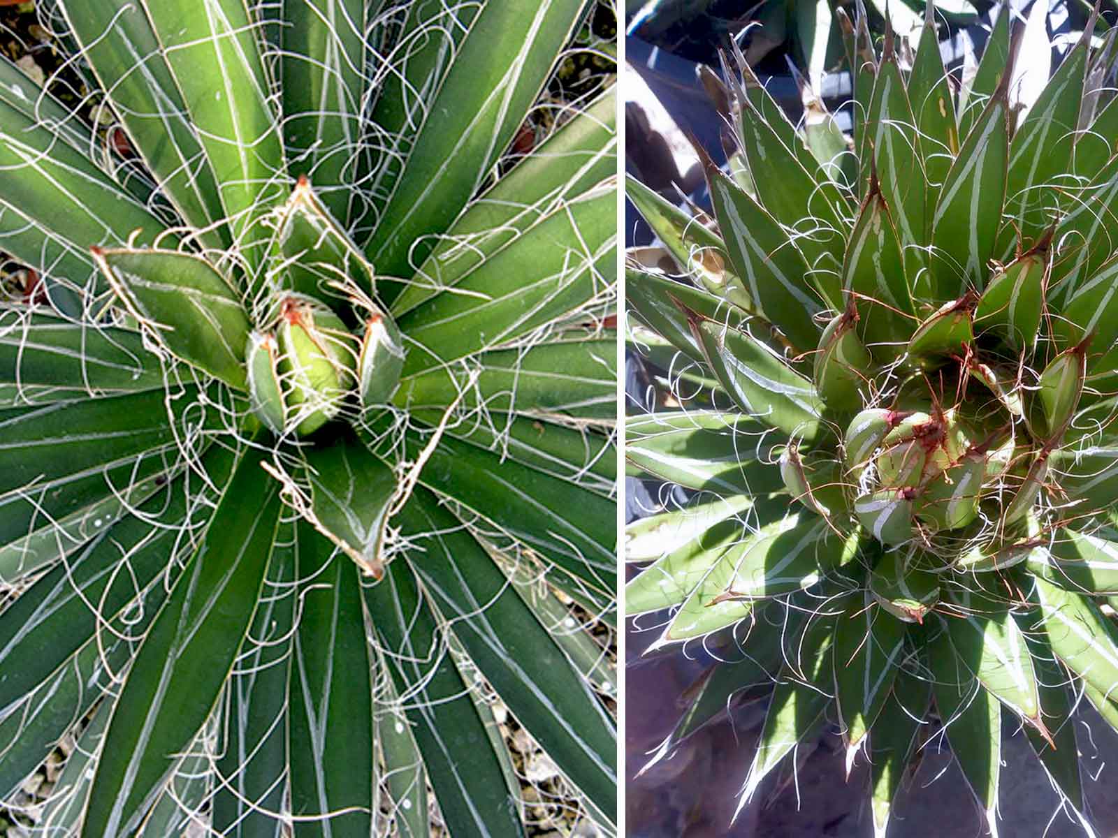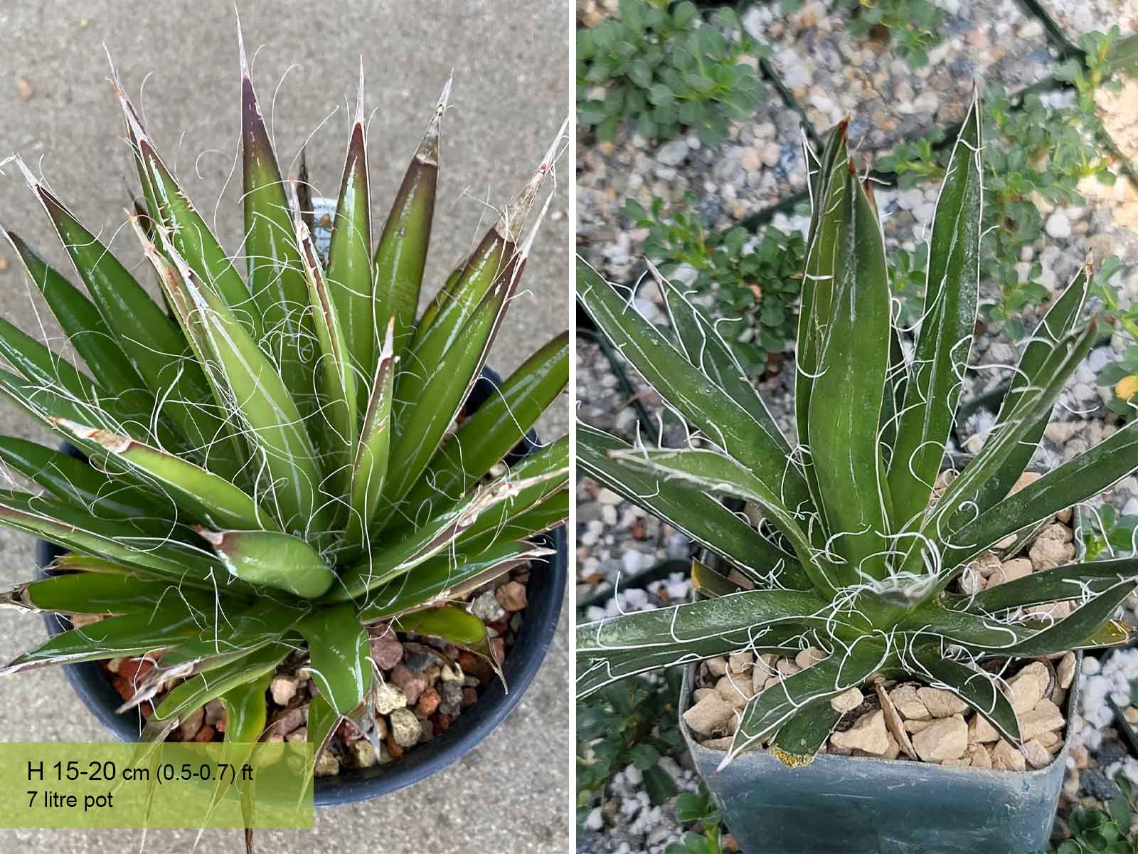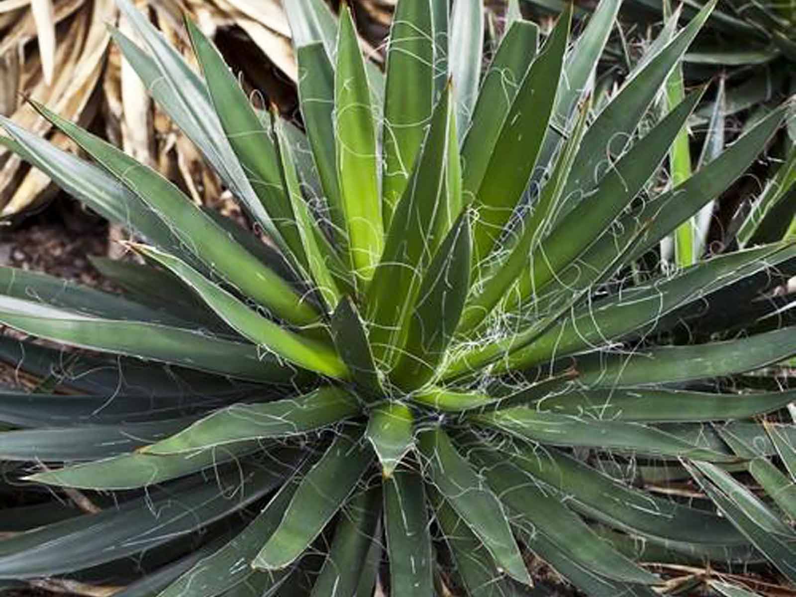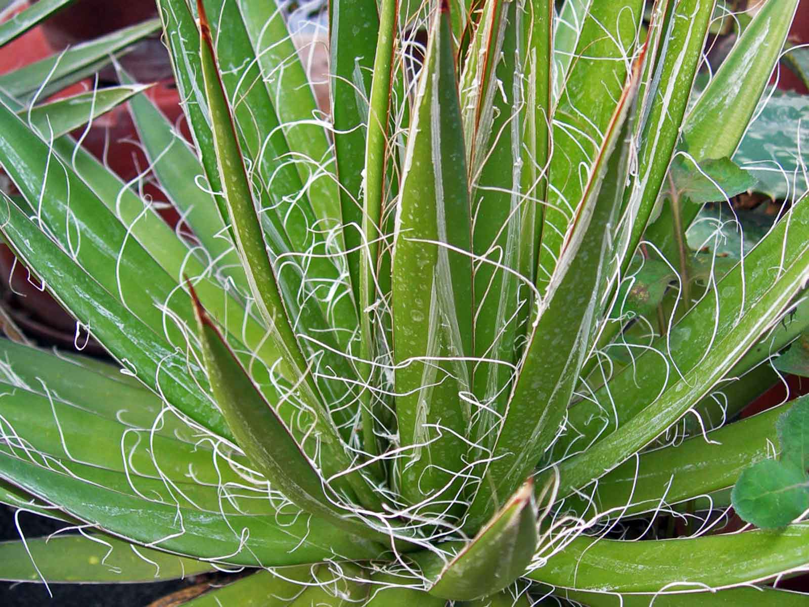 Genus of succulent, mostly native to the hot and dry regions of Mexico southern states of North America, now naturalised to the Mediterranean area. The leaves are arranged in a rosette. They are fleshy with a thorn at the tip and often sharply toothed at the edges. After many years it produces inflorescences of pale yellow, bell-shaped flowers at the end of extremely long stalks. Agave Filifera is an evergreen perennial to 45cm, with compact rosettes of stiff, pointed leaves edged with long white fibres. Greenish-white flowers are borne in spikes on erect stems to 2.5 m.