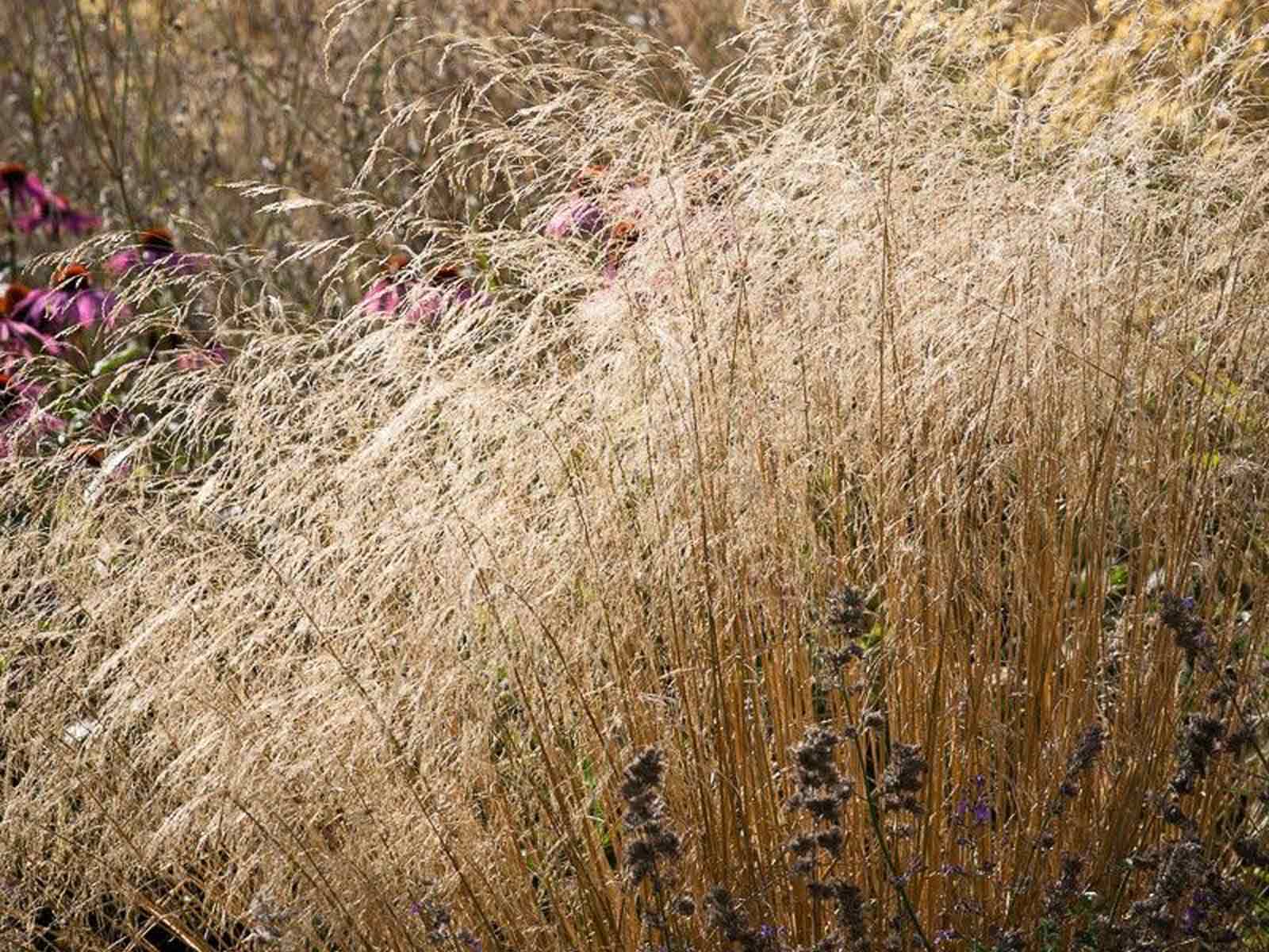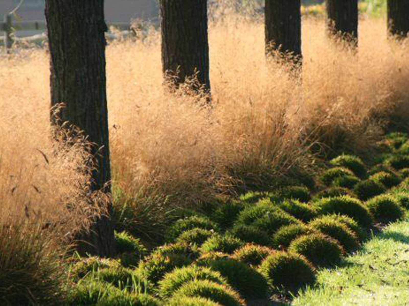 A wheat-like ornamental grass whose dark green leaves turn to golden brown as they mature.
