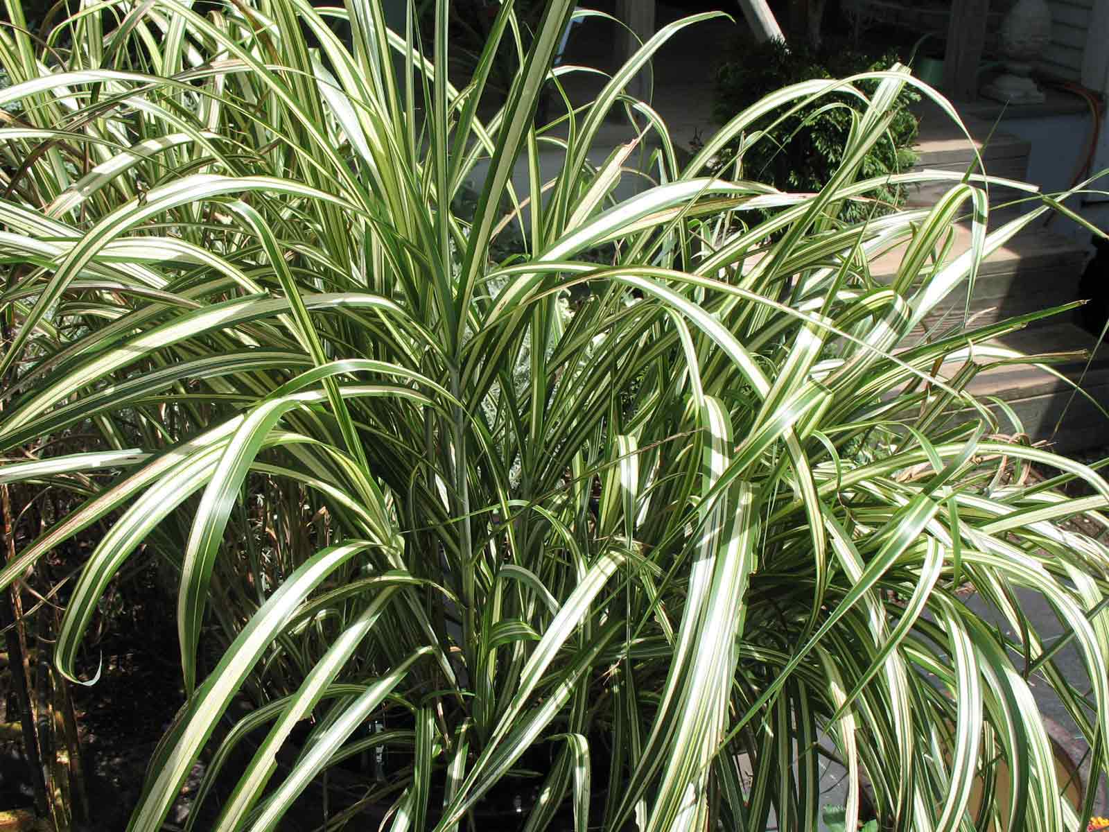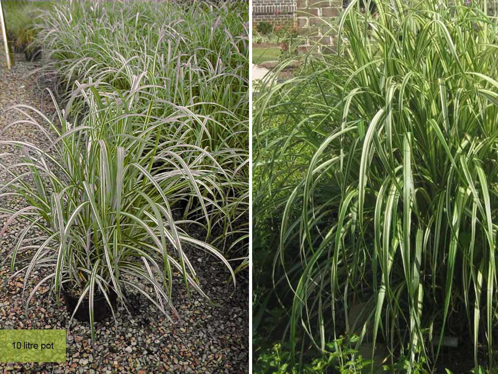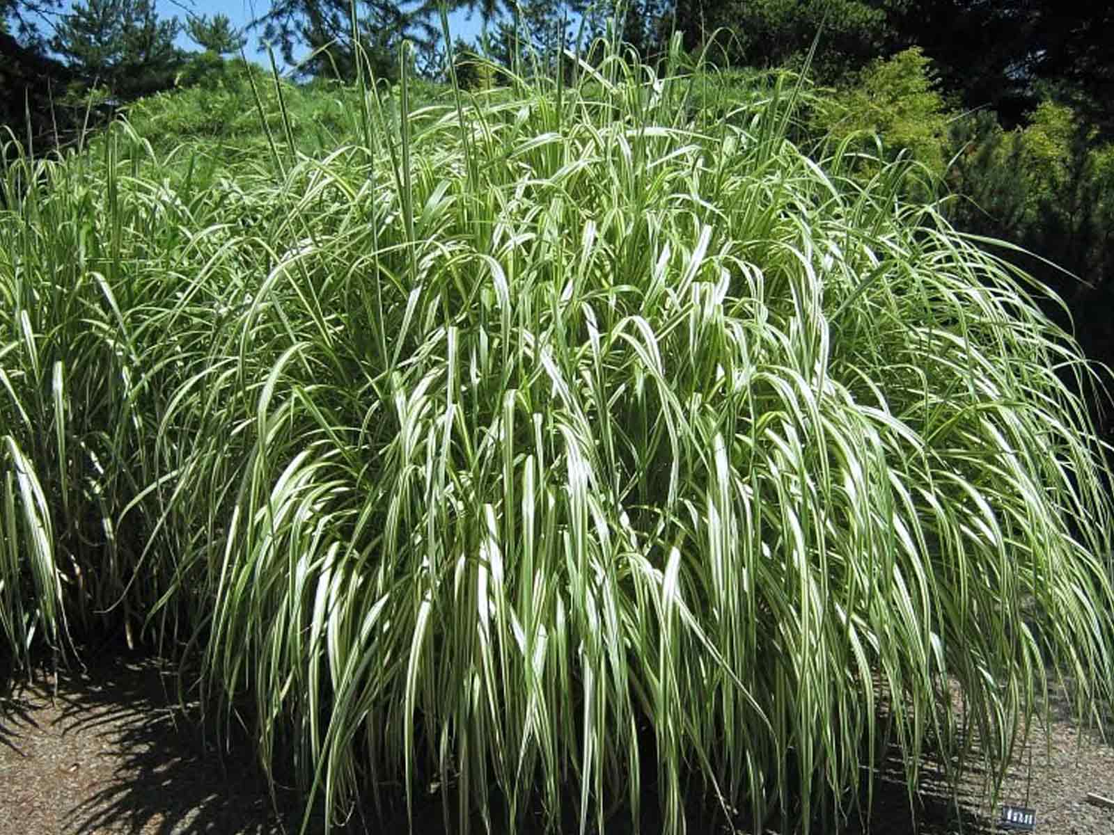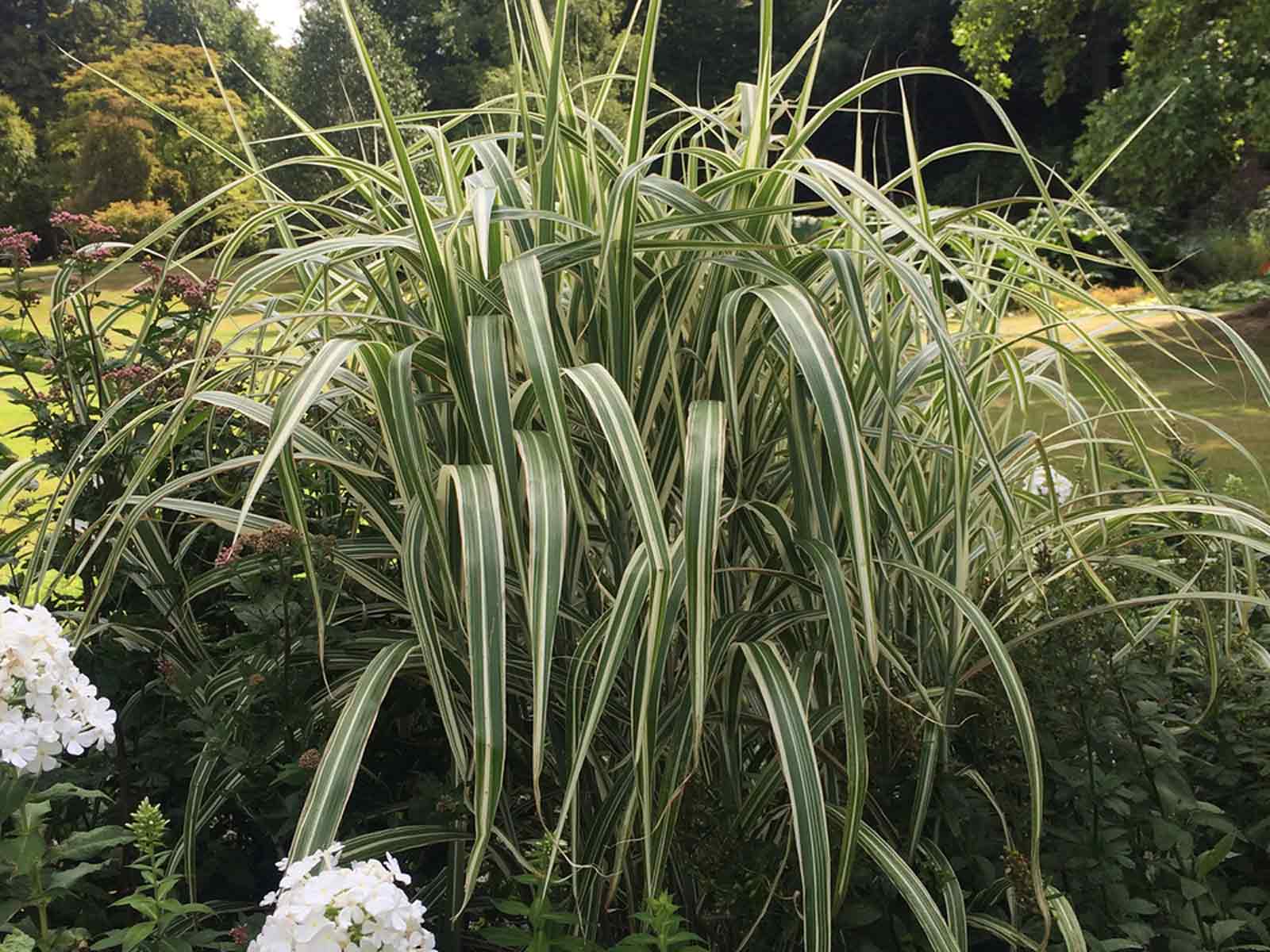 A tall weeping grass with a white stripe that runs down the middle of each leaf.