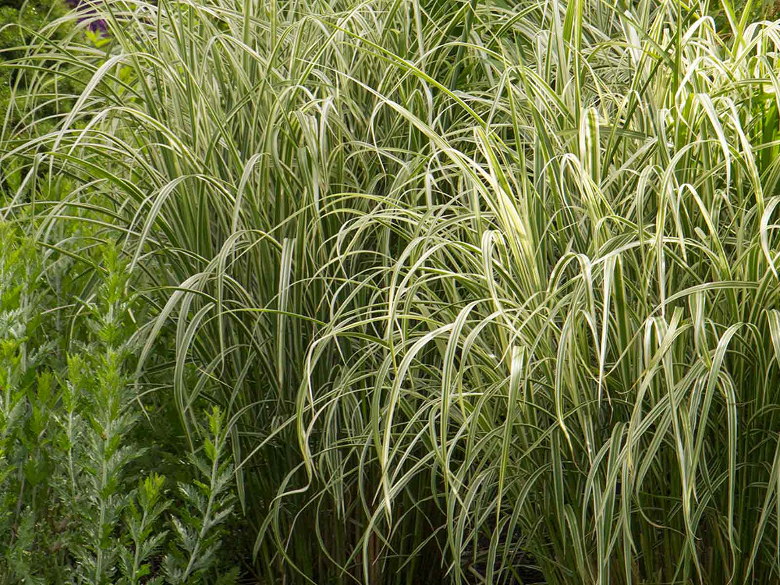 The Cabaret’s ‘sporty’ vertical stripes of bright white contrast against the plant’s dark green base colour and the result is an exciting composition of crisscrossing lines. A great choice for modern or urban gardens. The Cabaret also produces pink plumes of flowers that are so hardy they can easily last all through the autumn (although their pink colouring will change to silver as they mature).