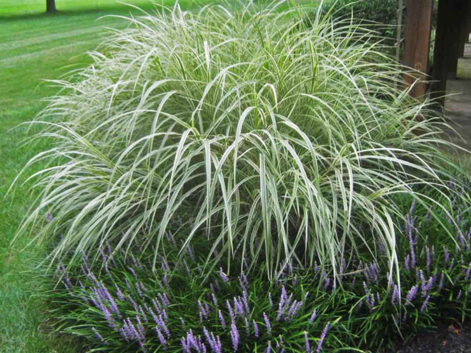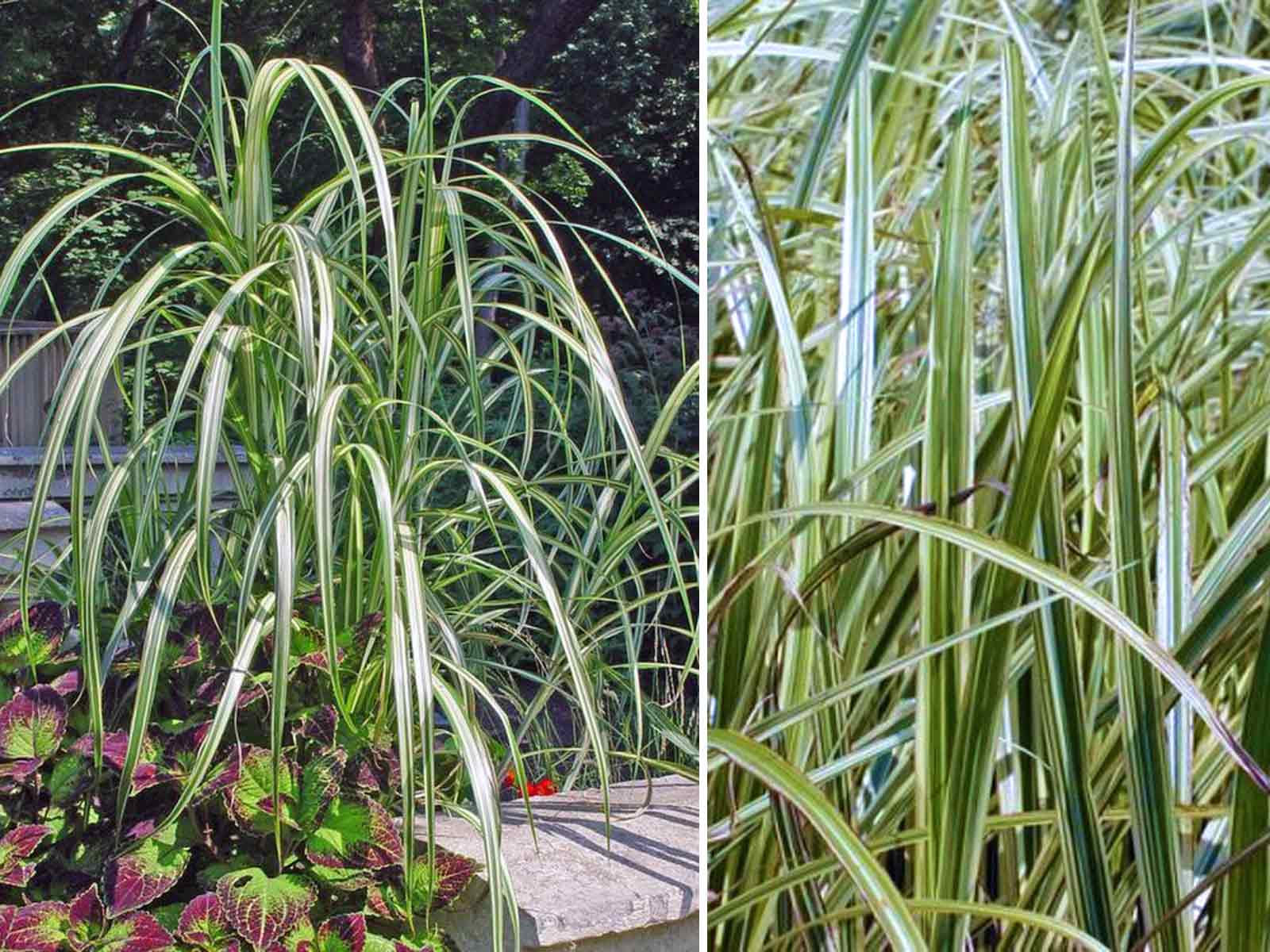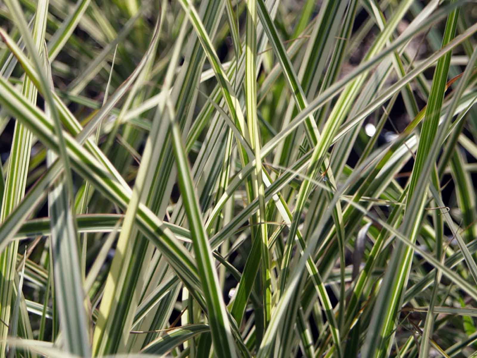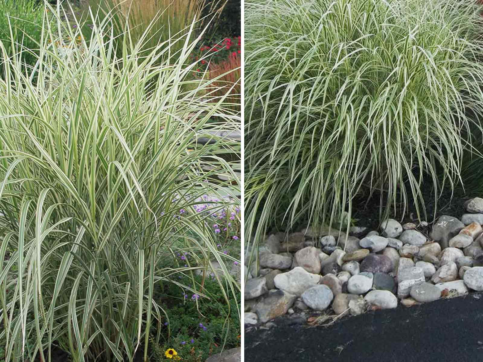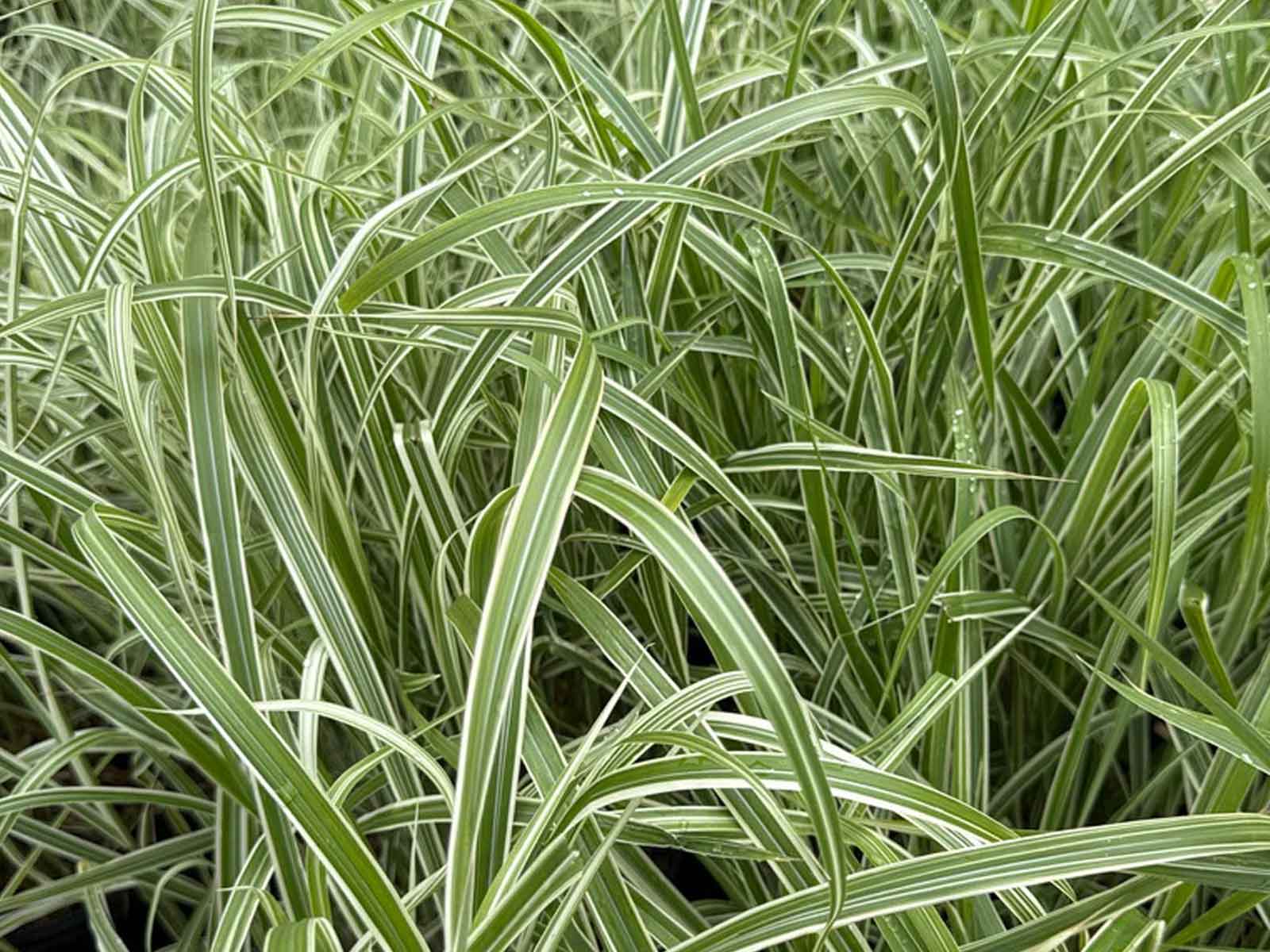 Similar to the Miscanthus Sinensis Cabaret, but with multiple white stripes instead of just one.