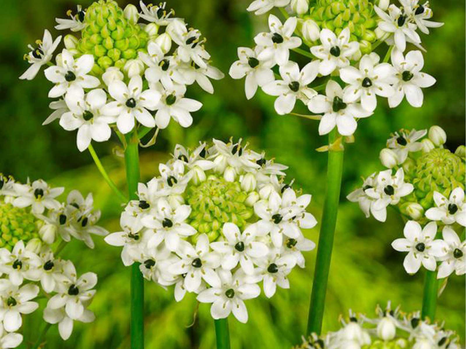 Ornithogalum saundersiae, commonly known as Giant Chincherinchee or African Star Flower, is a striking and elegant bulbous perennial native to South Africa. It produces tall, upright stems topped with large, rounded clusters of star-shaped white flowers with distinctive black centers. The glossy, dark green foliage forms a neat base, making it a favorite for borders and cut flower arrangements.