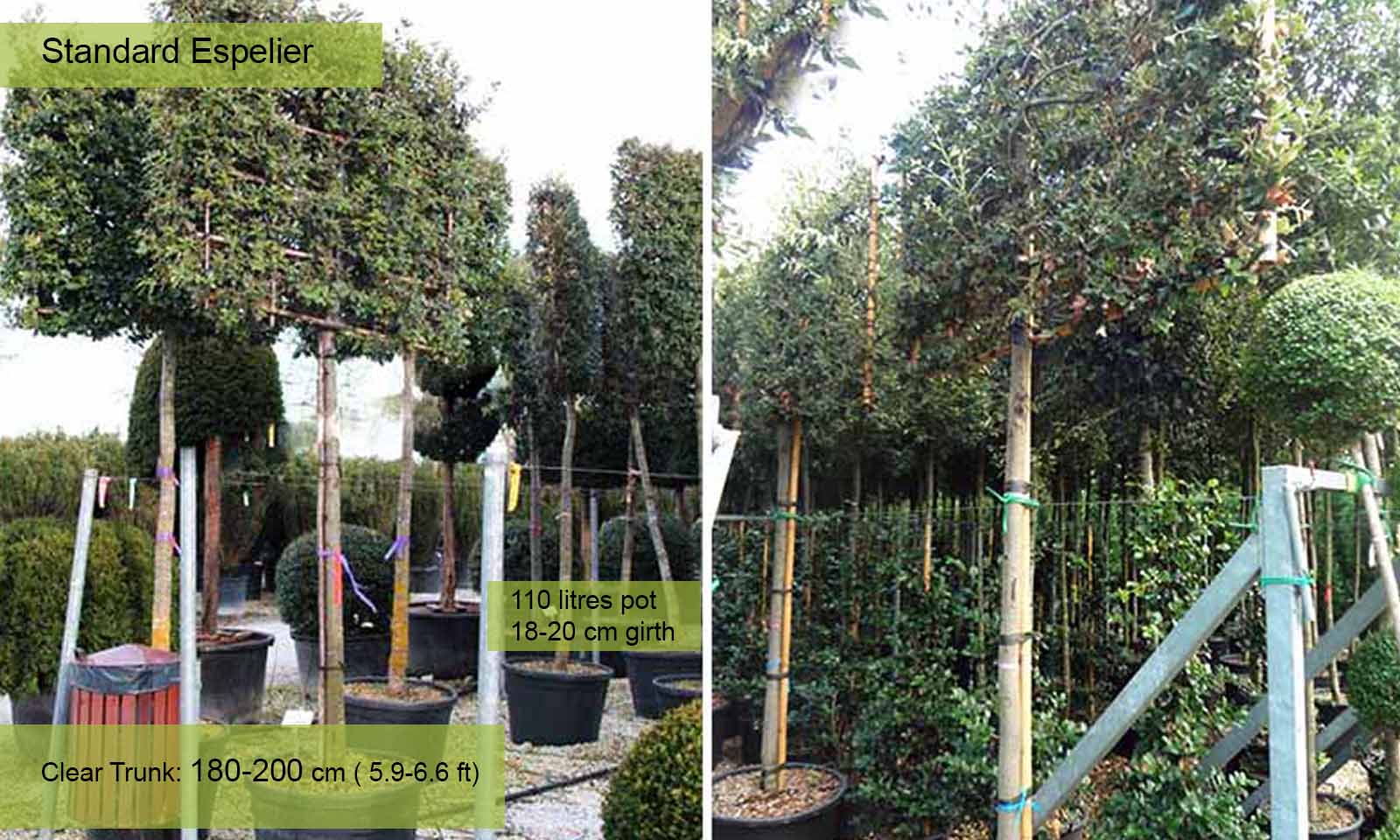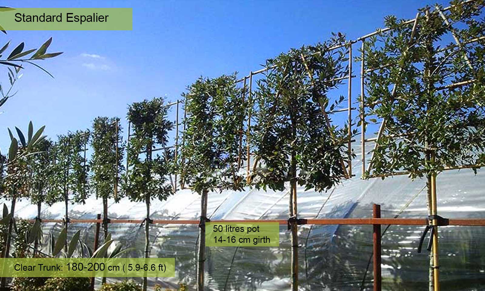Girth 18-20 cm: 110 litre pot, Trunk – 200 cm (6.6 ft), Trellis – W140 x H120 cm (4.6 x 3.9 ft);