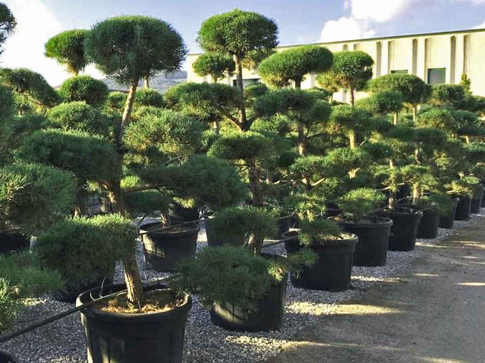 A wonderful collection of White Pine Bonsai Trees, with bluey-green needles arranged into graceful crowns.
