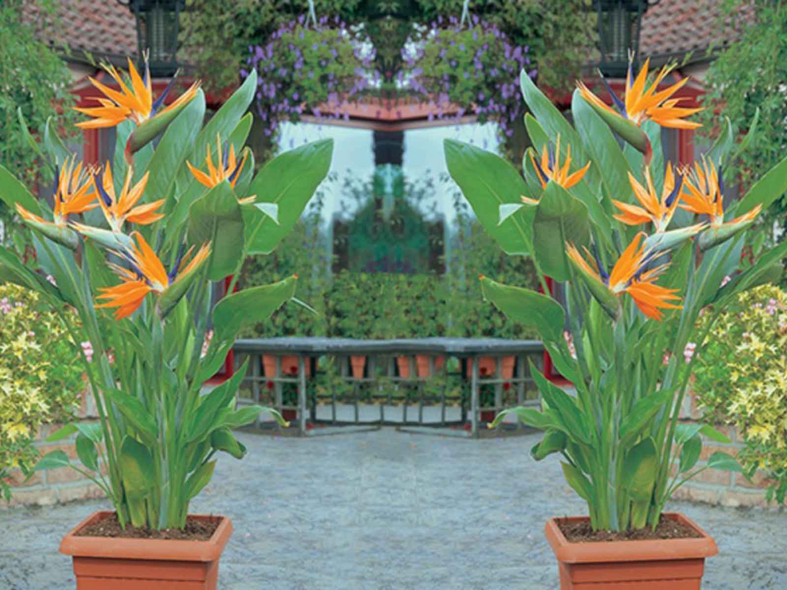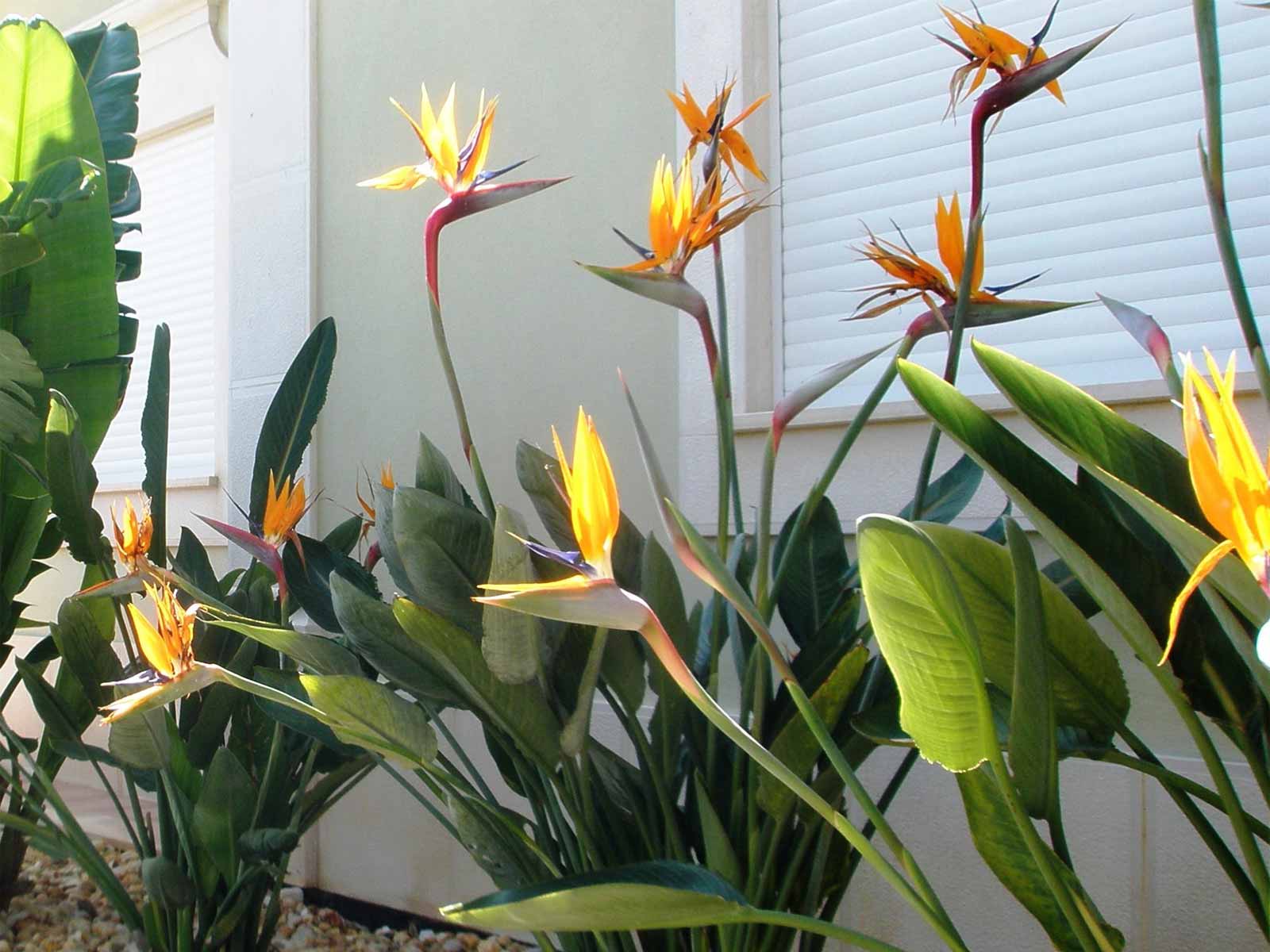 Evergreen, perennial plant which forms clumps which look like Banana plants. The ovate, glaucous green leaves are 40-50 cm long and 15-20 cm wide and the stalks are 60 cm tall. Throughout the summer floral stalks appear at intervals at the end of which there are very unusual, large flowers. The floral stalks are taller than the tufts, they start from the foot and end in flowers with orange and yellow, lanceolate sepals and blue petals.