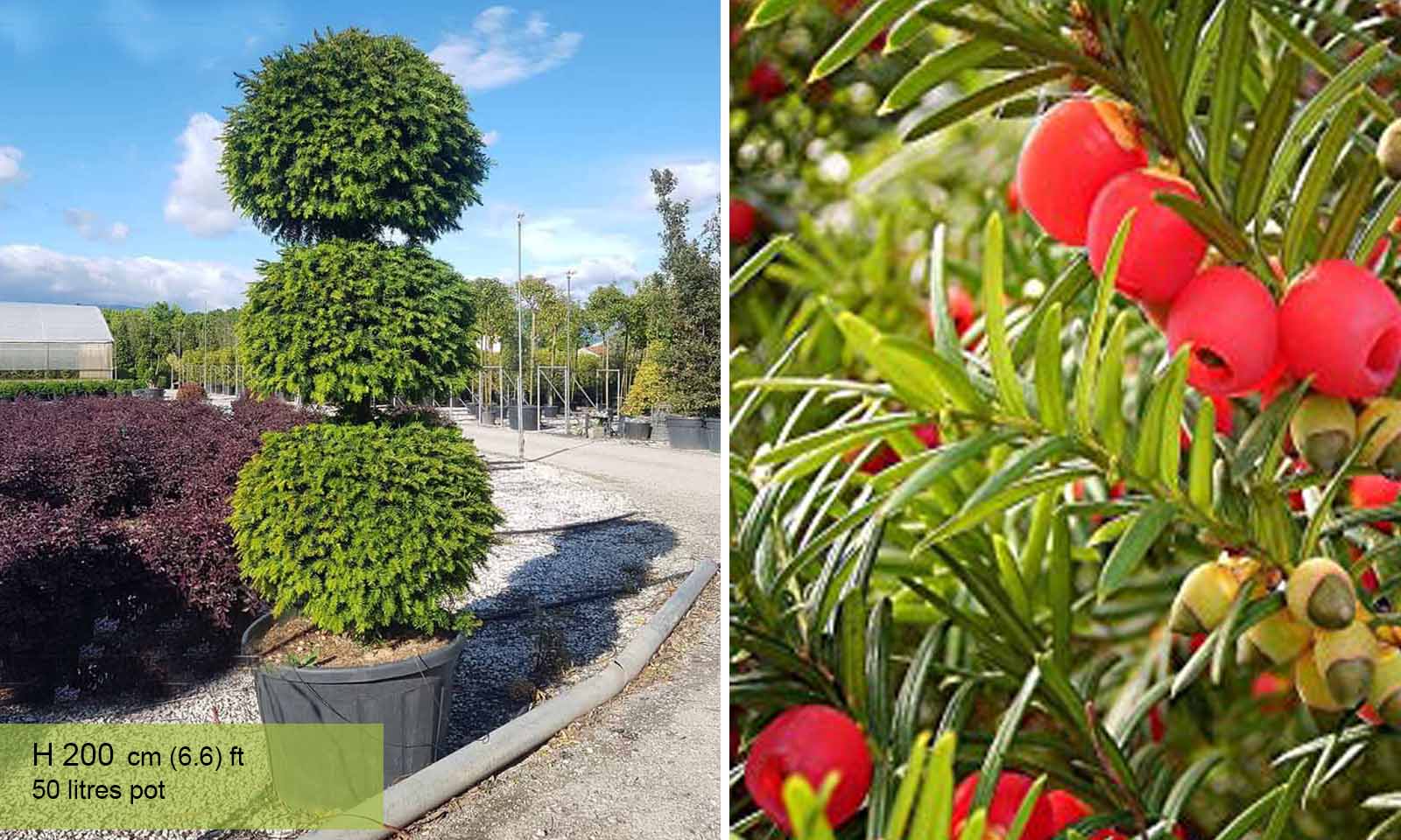 Withstands being covered by old trees. Used a lot for hedges because it tolerates severe, repeated pruning and it is also for this reason that this plant is used for creating geometric shapes and Giant Garden Bonsai. No regular pruning is required but trimming and shaping throughout the spring and summer months is advisable. The hardy rating is (H7) making this plant perfect all year throughout the UK. Fruit can grow in the Autumn time but it is advisable not to eat anything due to high levels of toxicity associated with this plant.