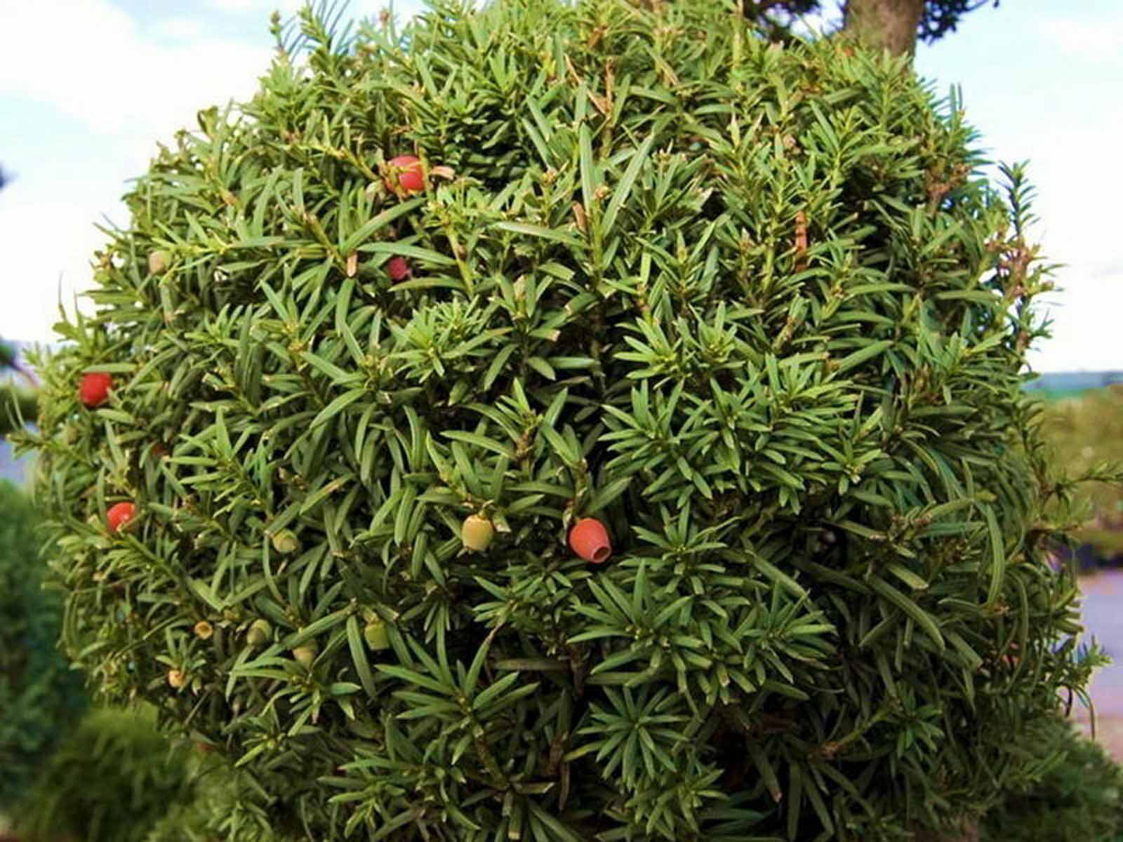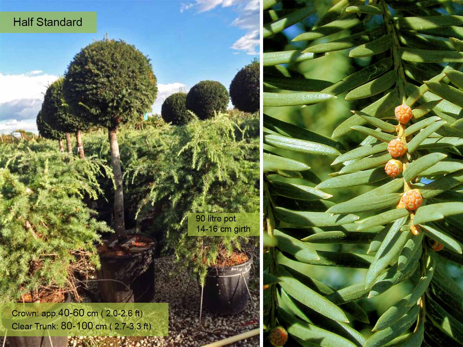 Taxus Baccata – conifer with main horizontal branches and secondary branches short and weeping. If left to grow freely and if it has enough space it will become a broadly conical tree with spreading, horizontal branches. Male cones are yellow in spring, followed by beautiful red fruit. Grows well in fertile, well drained soil including chalky and acid soil. Withstands being covered by old trees.