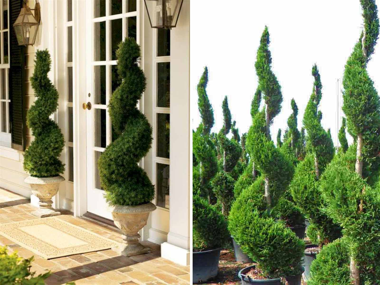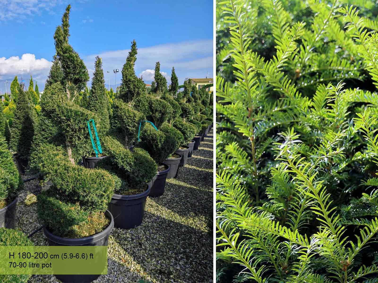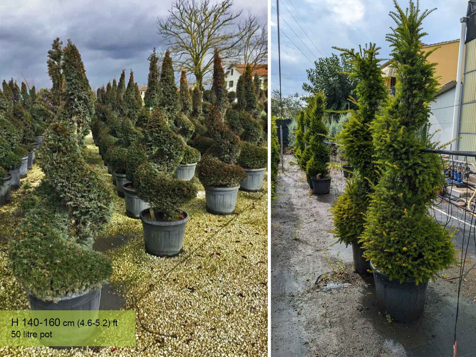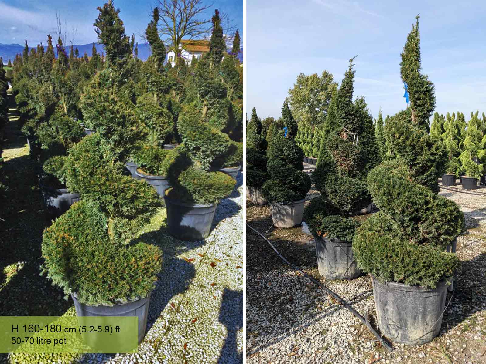 An impressive spiral topiary grown from Taxus Baccata (English Yew). The slow growth rate of English Yew means an added advantage as yew topiary only needs to be clipped once a year in late summer to maintain its shape. Taxus Baccata – conifer with main horizontal branches and secondary branches short and weeping. If left to grow freely and if it has enough space it will become a broadly conical tree with spreading, horizontal branches. Male cones are yellow in spring, followed by beautiful red fruit. Grows well in fertile, well drained soil including chalky and acid soil.